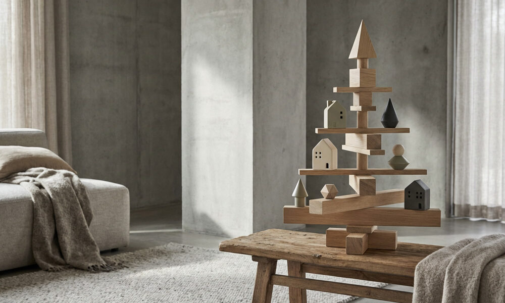 Το χριστουγεννιάτικο δέντρο παραμένει, αλλά μεταμορφώνεται. Δεν χρειάζεται να είναι ψηλό, ούτε φορτωμένο. Μπορεί να είναι μικρό, λεπτό, σχεδόν γλυπτικό. Μπορεί ακόμα και να υπονοείται: ένα κλαδί σε βάζο, μια κατασκευή από ξύλο, μια αφαιρετική μορφή στον τοίχο.